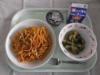 【牛乳・トマトスパゲティ・大根と白菜のサラダ・米粉のチョコケーキ】 今日は我孫子...