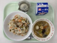 牛乳、麦ごはん、まめまめみそ豆、筑前煮、むらくも汁、はるみ
