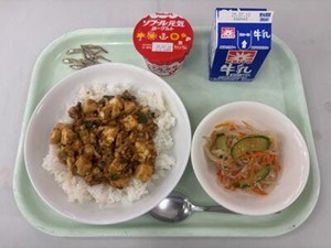 牛乳、麻姿豆腐丼、春雨の和え物、煮干し、ヨーグルト