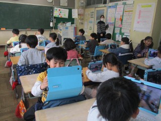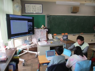 みんな、テレビ画面の中の先生の話をよく聞き、カメラの撮影や保存方法、みんなで共有する方法などなど楽しく勉強しました。