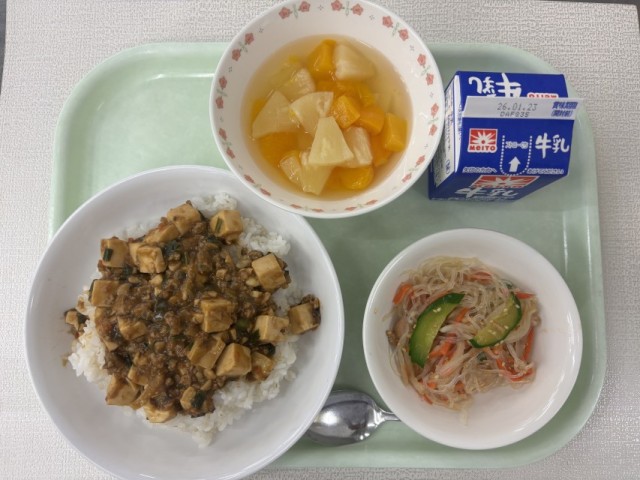 牛乳、麻婆豆腐丼、春雨の和え物、フルーツポンチ