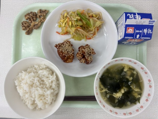 今日の給食 1月27日 公開日 2026/02/05 更新日 2026/02/05 給食 牛乳、麦ごはん、ヤンニョムチキン、豆もやしのナムル、わかめスープ、黒糖くるみ【学校給食週間 韓国料理】 今日は、韓国料理のヤンニョムチキンです。衣をつけて揚げた唐揚げに甘辛いタレを絡めました。韓国の伝統菓子には「くるみ饅頭」があります。今日は、くるみを使った甘いデザートを給食で作りました。