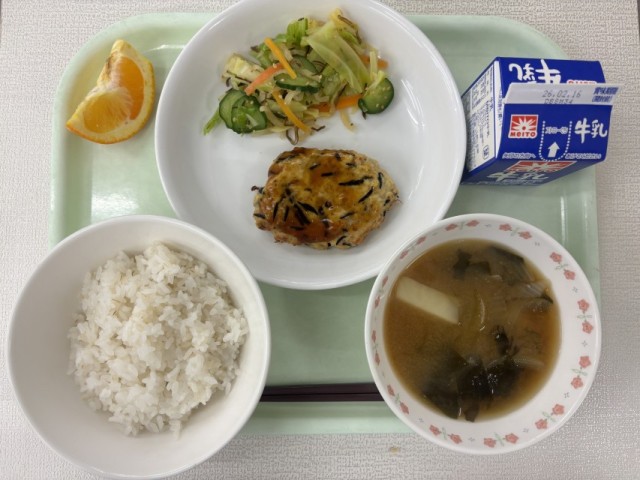 牛乳、豆腐とひじきのハンバーグ、キャベツの塩昆布和え、みそ汁、いよかん
