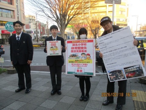 2月18日(水)我孫子二階堂高校生徒会の皆さんが、我孫子駅前にて夕方に、昨年度近隣の火事のため焼失した湖北小体育館の再建設のための募金活動を行っていました。大きな声をあげて歩く人々に募金を呼び掛けてくれていました。学校では野球部の皆さんも募金活動をしてくれているということも先生から聞き、感謝申し上げます。ありがとうございます。募金活動は今週月曜日から始まり、金曜日まで行うそうです。