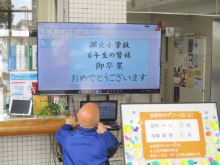 コホミンのロビーにあるモニターには「6年生のみなさんご卒業おめでとうございます。」の文字が映されていました。コホミンのみなさんありがとうございます。体育館の工事も始まりましたが、体育館がない現在、コホミンの皆様には感謝の気持ちでいっぱいです。これからもどうぞよろしくお願いします。