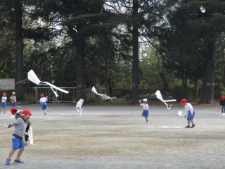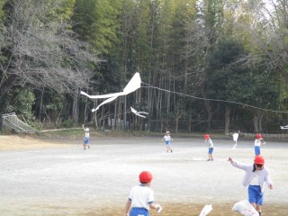 色を塗ったり、模様を描いたり、世界に1つだけのたこを作り、完成したたこを持って校庭でたこあげを行いました。