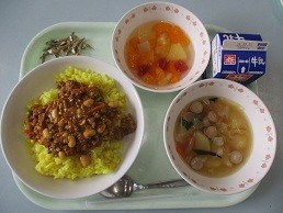 牛乳 ターメリックライス チリコンカーネ じゃがいも入り野菜スープ 煮干し サイダーポンチ