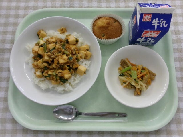 マーボー豆腐丼、小松菜とメンマのごま酢和え、甘納豆マフィン、牛乳