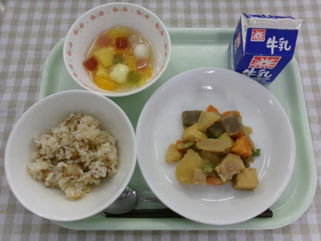 さといもごはん、鶏肉と野菜のごま煮、お月見白玉フルーツポンチ、牛乳