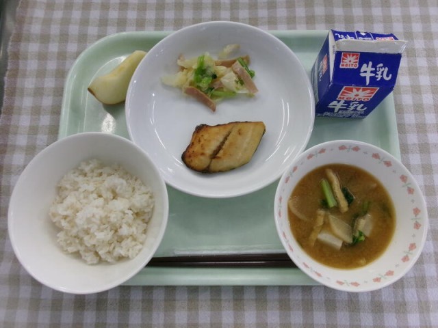 10月28日(火)の給食 公開日 2025/10/31 更新日 2025/10/31 給食室から 献立ごはん、さわらの西京焼き、かぶとハムの和え物、だいこんと里芋のみそ汁 今日は我孫子産野菜の日です。みそ汁に使った里芋が我孫子市の中里から届きました。
