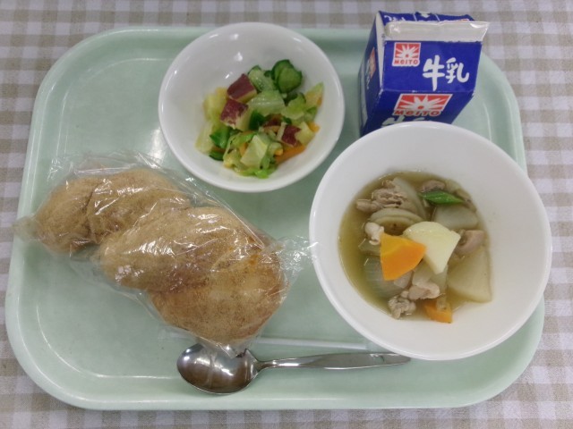 きなこ揚げパン、和風チキンポトフ、さつまいものサラダ、牛乳