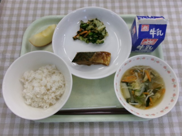 ごはん、さばのみそ煮、野菜ののり和え、はくさいのすまし汁、りんご、牛乳