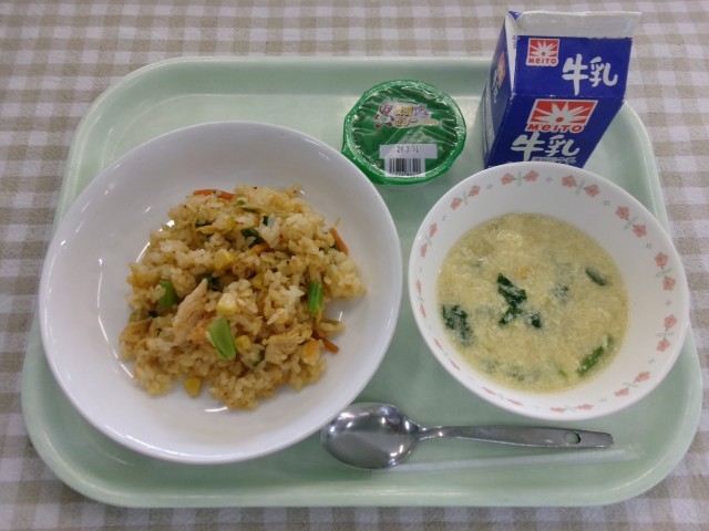 キムチチャーハン、中華風卵スープ、麦芽ゼリー、牛乳
