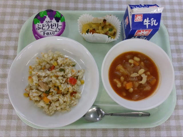 ツナピラフ、グリーンロケッツオムレツ、チキンミネストローネ、ぶどうゼリー、牛乳