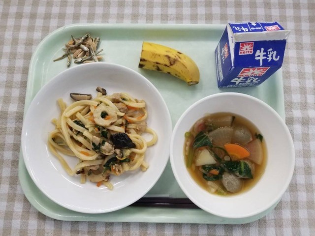 焼うどん、いわしのつみれ団子汁、小魚アーモンド、バナナ