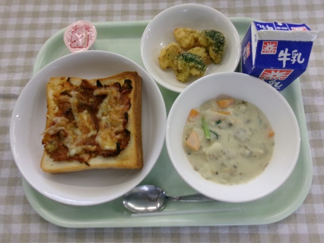 12月9日(火)の給食 公開日 2025/12/09 更新日 2025/12/09 給食室から 献立ツナピザトースト、あさりの米粉チャウダー、ブロッコリーとカリフラワーのフリッター、ひと口いちご牛乳プリン、牛乳今日は我孫子産野菜の日です。チャウダーに入れたにんじんと小松菜が我孫子市の畑から届きました。