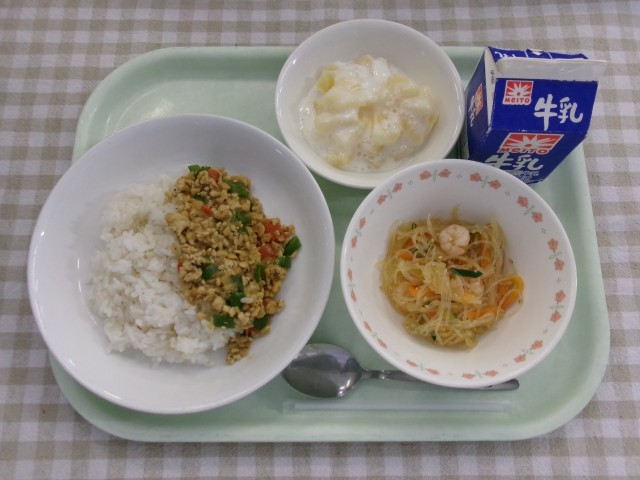 ガパオライス、ヤムウンセン、パイナップルヨーグルト、牛乳