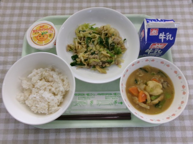 ごはん、にら豚、だんご汁、ムース(豆乳みかん味)、牛乳