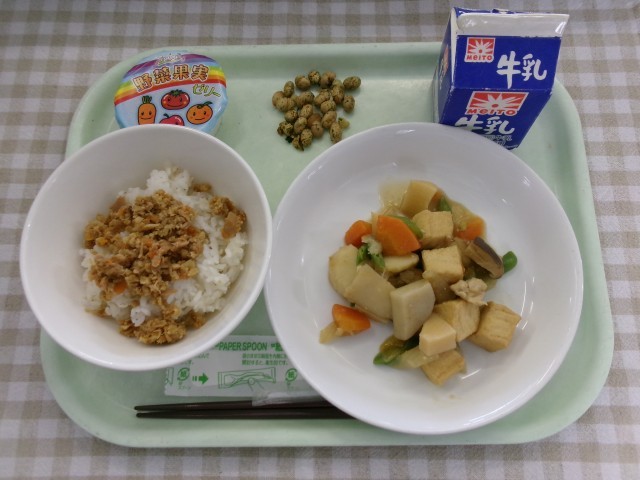 ごはん、ツナそぼろ、生揚げと野菜のうま煮、青のり大豆、野菜果実ゼリー、牛乳