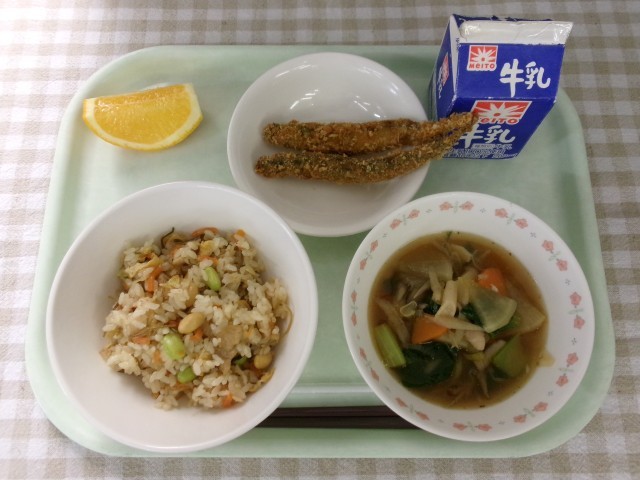 大豆と昆布の混ぜご飯、ししゃものカレーフライ、けんちん汁、はっさく、牛乳