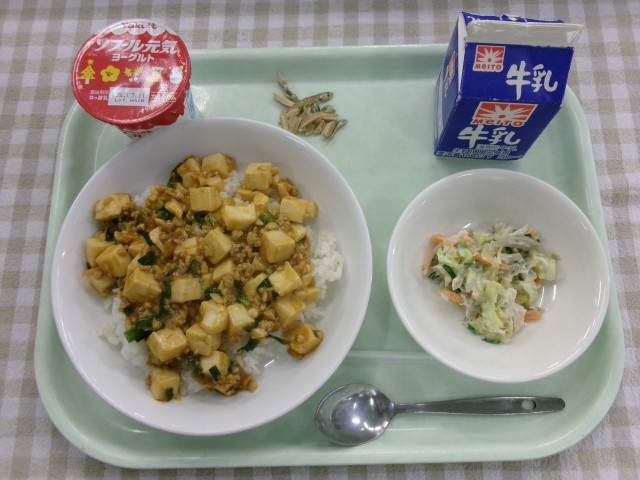 麻婆豆腐丼、ごぼうサラダ、小魚アーモンド、ヨーグルト、牛乳