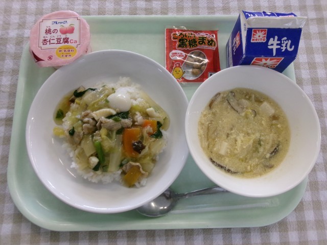 3月5日(木)の給食 公開日 2026/03/05 更新日 2026/03/05 給食室から 献立中華丼、酸辣湯、黒糖大豆、桃の杏仁豆腐、牛乳中華丼には、うずらの卵やイカを使いました。これらの食品は、丸のみしてしまうとのどに詰まってしまうことがあります。給食指導では、食事中は落ち付いてよく噛んで食べる様伝えたいと思います。