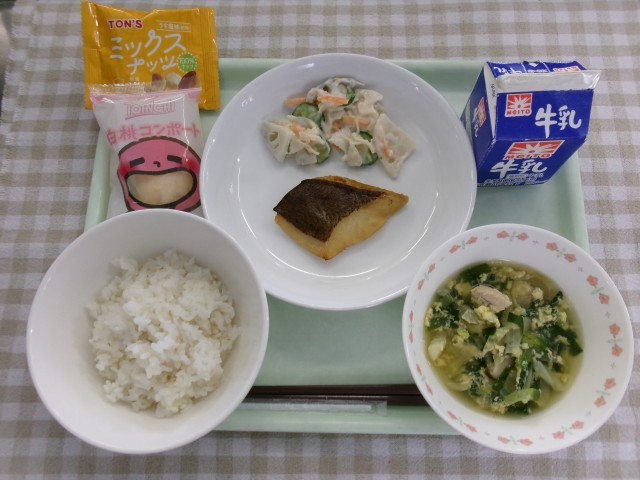 ごはん、かれいのみりんしょうゆ焼き、れんこんと鶏肉のマヨ和え、ミックスナッツ、にら玉汁、ピーチコンポート、牛乳