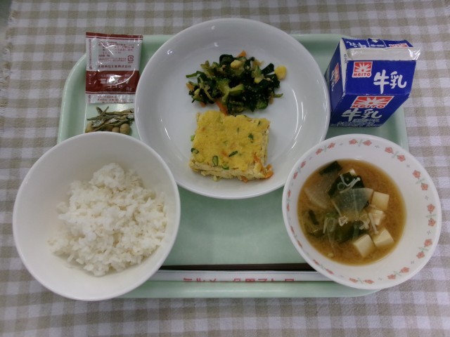 ごはん、擬製豆腐、海藻と野菜のごま和え、豆腐のみそ汁、小魚大豆、ミルメークココア、牛乳