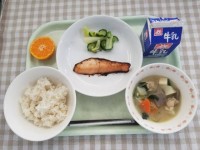献立ごはん、さけの塩焼き、野菜の浅漬け、けんちん汁、ぽんかん、牛乳