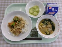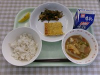 献立ごはん、ツナそぼろ、生揚げと野菜のうま煮、青のり大豆、野菜果実ゼリー、牛乳