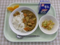 献立チキンカレーライス、和風サラダ、オレンジ、牛乳