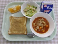 献立ごまトースト、ソーセージのミネストローネ、ツナとコーンのサラダ、いよかん、牛...
