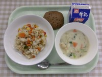 献立ツナピラフ、チキンの米粉チャウダー、手づくりチョコチップクッキー、牛乳