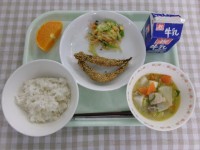 献立大豆と昆布の混ぜご飯、ししゃものカレーフライ、けんちん汁、はっさく、牛乳