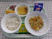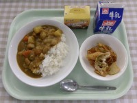 献立チキンカレーライス、野菜チップスのり塩味、お祝いチョコケーキ、牛乳今年度給食...