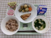 献立ごはん、さわらの菜種焼き、野菜のごま酢和え、豆腐のみそ汁、いよかん、牛乳