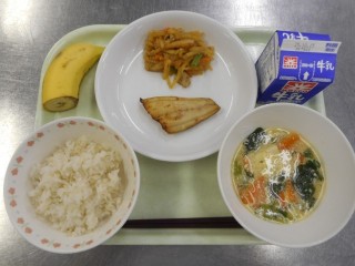 10月8日の給食 公開日 2025/10/23 更新日 2025/10/23 R7年度の給食 10月8日の給食【ごはん・ホッケのピリ辛焼き・じゃがいものきんぴら・かきたま汁・バナナ】 今日の魚は「ほっけ」です。漢字だと、魚へんに花と書きます。ほっけの赤ちゃんが群れで水面に向かって泳ぐ様子が花のようにきれいに見えることから、この漢字になったそうです。ほっけは、北海道より北の寒い海に住んでいます。すぐに鮮度が落ちてしまうので、干物にして全国に届けられることが多い魚です。