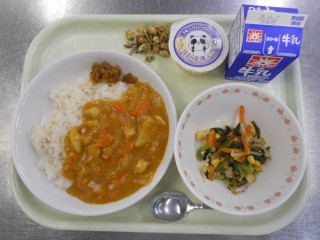 【チキンカレーライス・小松菜のおかか和え・青のり大豆・ブルーベリーゼリー】