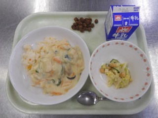 10月22日の給食 公開日 2025/10/23 更新日 2025/10/23 R7年度の給食 10月22日の給食【キャロットライス・チキンクリームソース・さつまいものサラダ・ココア大豆】 さつまいもは秋が旬の食べ物です。日本で一番さつまいもを作っているのは、鹿児島県です。次に茨城県、千葉県はその次の三位です。さつまいもには、エネルギーのもとになる炭水化物のほかに、体の調子をととのえるビタミンCもたくさん含まれています。今日はサラダにしました。よく噛んで食べましょう。