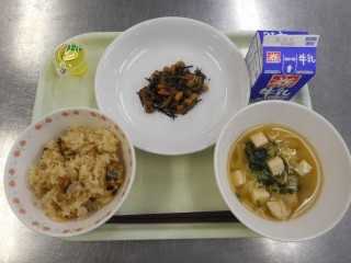 【秋刀魚ごはん・大豆とひじきの煮付け・豆腐と白菜のすまし汁・ひとくちレモンゼリー】