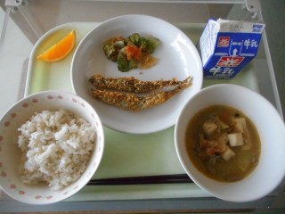 10月28日の給食 公開日 2025/10/28 更新日 2025/10/28 R7年度の給食 10月28日の給食【ごはん・ししゃもの大豆フライ・大根のピリ辛漬け・ごまキムチ汁・オレンジ】 今日の汁物には韓国の漬物「キムチ」が入っています。白菜やニラ、にんじんなどの野菜を唐辛子や魚介類のエキスと一緒に漬け込んで作られています。唐辛子にはカプサイシンという成分が入っているので、食欲が出たり体を温める働きがあります。今日のように肌寒い日にはぴったりです。