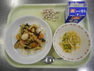 9月5日の給食 公開日 2025/10/31 更新日 2025/10/31 給食室から 9月5日の給食【牛乳・中華丼・じゃがいもともやしのサラダ・白雪大豆】 中華丼は日本で考えられた食べ方で、ごはんの上に八宝菜をのせた丼物です。八宝菜の八は、8種類の材料を使ったという意味ではなく、いろいろな食材を使ったという意味です。 今日の中華丼には豚肉、たまねぎ、にんじん、小松菜、かまぼこ、なると、たけのこ、椎茸、うずらの卵と、たくさんの食材を使っています。