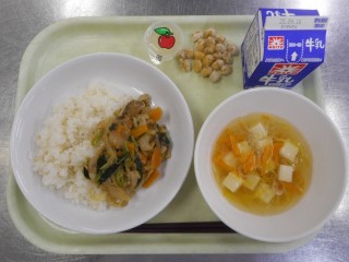 【牛乳・ごはん・なすとキャベツのみそ炒め・菊のすまし汁・ペッパービーンズ・ひとくちりんごゼリー】