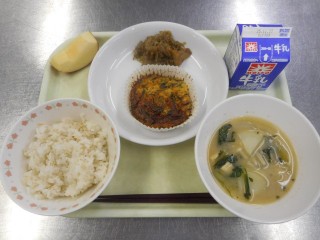 【牛乳・ごはん・ひじき入り卵焼き・茎わかめのきんぴら・じゃがいものみそ汁・りんご】