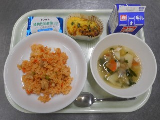 【牛乳・チキンライス・グリーンロケッツオムレツ・豚肉と白菜のスープ・ヨーグルトレーズン】