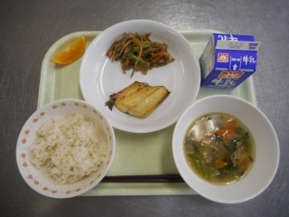 【牛乳・ごはん・サバのカレー焼き・五目きんぴら・のっぺい汁・オレンジ】