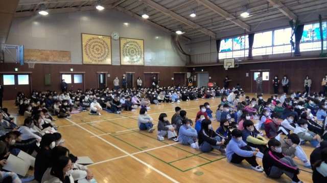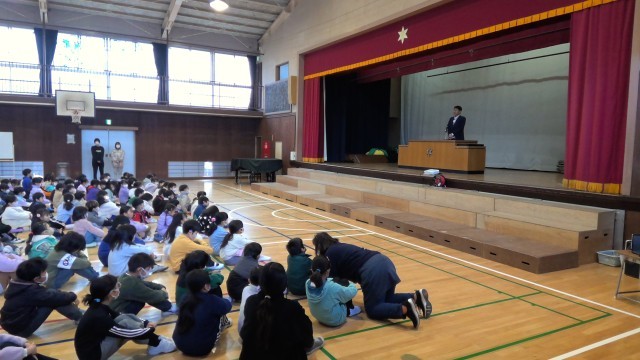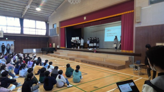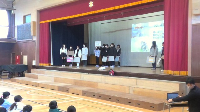 寒さも深まり、日に日にプールにも氷がはる季節となりました。2月の全校集会では今月の生活目標「寒さに負けず、元気に生活しよう」を保健委員会がクイズ形式に発表をし、体調管理の仕方について全校で考えました。