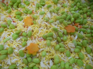 今日はひな祭りです。ひな人形を飾って、桃の花やひしもちを供え、子どもの健やかな成長をお祝いします。今日は給食でもひな祭りにちなんだ献立です。お祝い事のときによく食べる、ちらしずしを取り入れました。すまし汁にも桃の花をイメージしたピンク色のお麩が入っています。