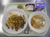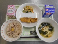 【牛乳・ごはん・サバのオレンジ煮・野菜ののり和え・じゃがいものみそ汁・はるか】
