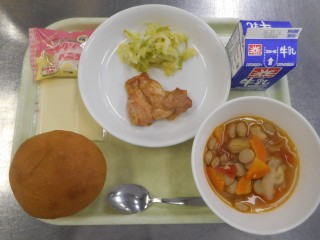 【牛乳・セルフチキンサンド(丸パン、てりやきチキン、キャベツ炒め、スライスチーズ)・レンズ豆のトマトスープ・クリーム大福】